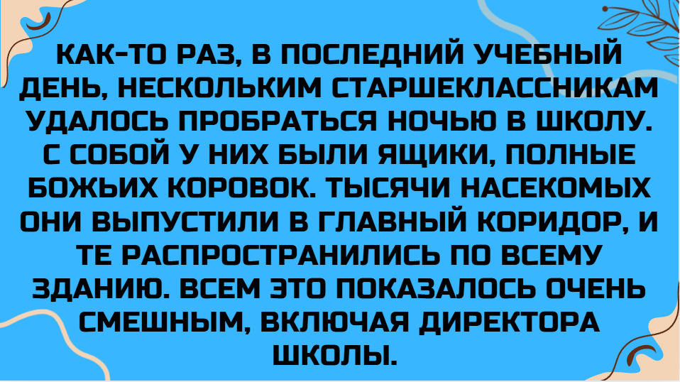 - Как-то раз, в последний учебный день, нескольким старшеклассникам удалось пробраться ночью в школу. С собой у них были ящики, полные божьих коровок. Тысячи насекомых они выпустили в главный коридор, и те распространились по всему зданию. Всем это показалось очень смешным, включая директора школы. © imawesome1124
