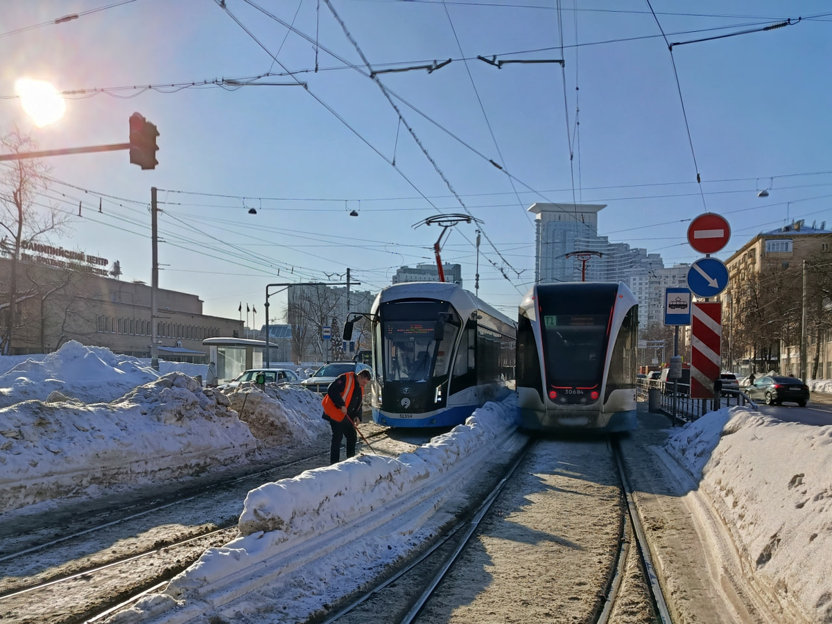 Ещё одна странная история плохой работы транспорта, связанная с морозами, случилась на трамваях. В конце января прошёл мощный снегопад, что сильно затруднило дорожную обстановку, и, в частности, трамвайное движение. Удивительно, что специалисты столько трудятся над всякими инновационными беспилотными технологиями, но не могут сделать простые погодонезависимые стрелки. Вроде бы стали ставить на них подогрев, чтобы падающий снег сразу таял, но почему-то оно когда надо не работает. Ну ладно, допустим, мощные снегопады бывают действительно не так часто, 2-3 дня в году можно бы было и потерпеть. Но дальше случилось странное: водители получили регламент перед каждой стрелкой выходить и идти вручную чистить её, а ехать, только убедившись, что проблем нет. Действительно, когда пути засыпаны снегом, водителям приходится заниматься этой непрофильной для них деятельностью (хотя по-хорошему, он вообще не должен выходить из кабины). Но по регламенту подобной вознёй должен заниматься КАЖДЫЙ водител
