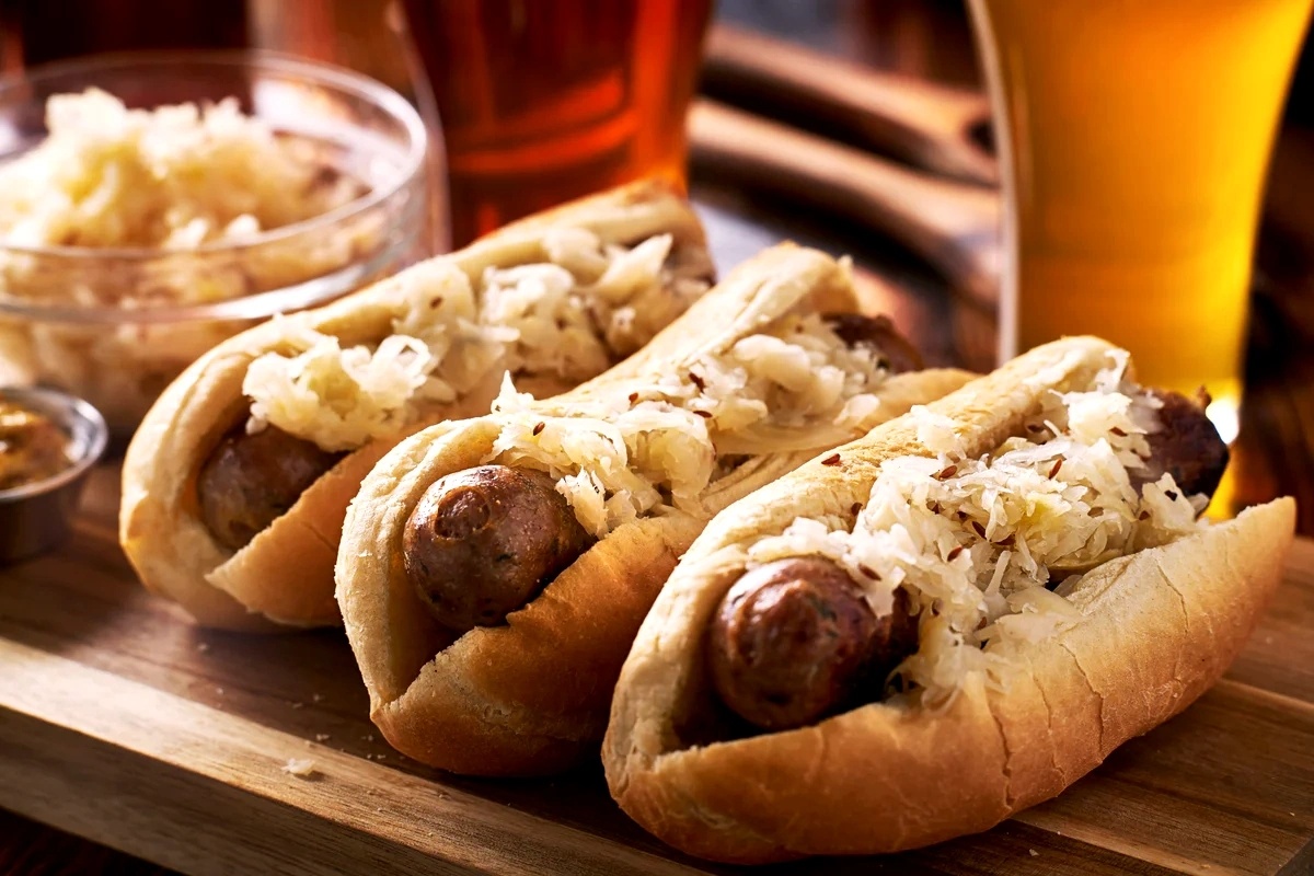■ Положите каждую сосиску в подогретую булочку, сверху выложите квашеную капусту. При желании добавьте горчицу.