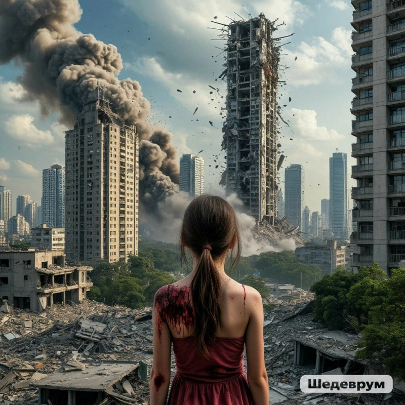 Сейчас же я стояла на обугленных останках старых фруктовых садов. В босые ноги больно впивались каменное крошево и щепки, бывшие когда-то очень красивыми домами и заборами пригорода. От золотистых виноградников остался только пепел, фермы были погребены под осколками изъеденных кислотой горных пород, уютные деревеньки были сожжены дотла Огнём и Вулканом. Вместо красивого города с небоскрёбами, памятниками культуры и тихими скверами только груда металлолома, битого стекла и камней. Мне очень хотелось есть и пить, но море пересохло из-за Засухи, а сады и фермы развеяны по ветру в прямом смысле этого слова. Стремительно холодало. Пришёл Лёд. Моя одежда была изодрана и держалась лишь на кусочке окровавленной ткани, прикованной осколком стекла в моей груди. Я почувствовала, как ледяная дрожь пронизывает всё тело и пришлось ускорить шаг. Вскоре ноги уже бегом несли меня в сторону главной башни, которая была готова осесть в любую минуту. Так и произошло. С оглушительным грохотом на меня посыпались кирпичи и щебень.