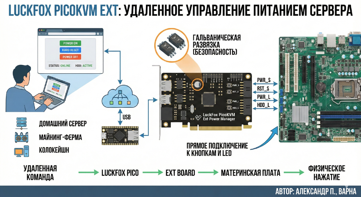 Это не карта видеозахвата (хотя она часть экосистемы KVM). Это специализированный контроллер ATX-питания.