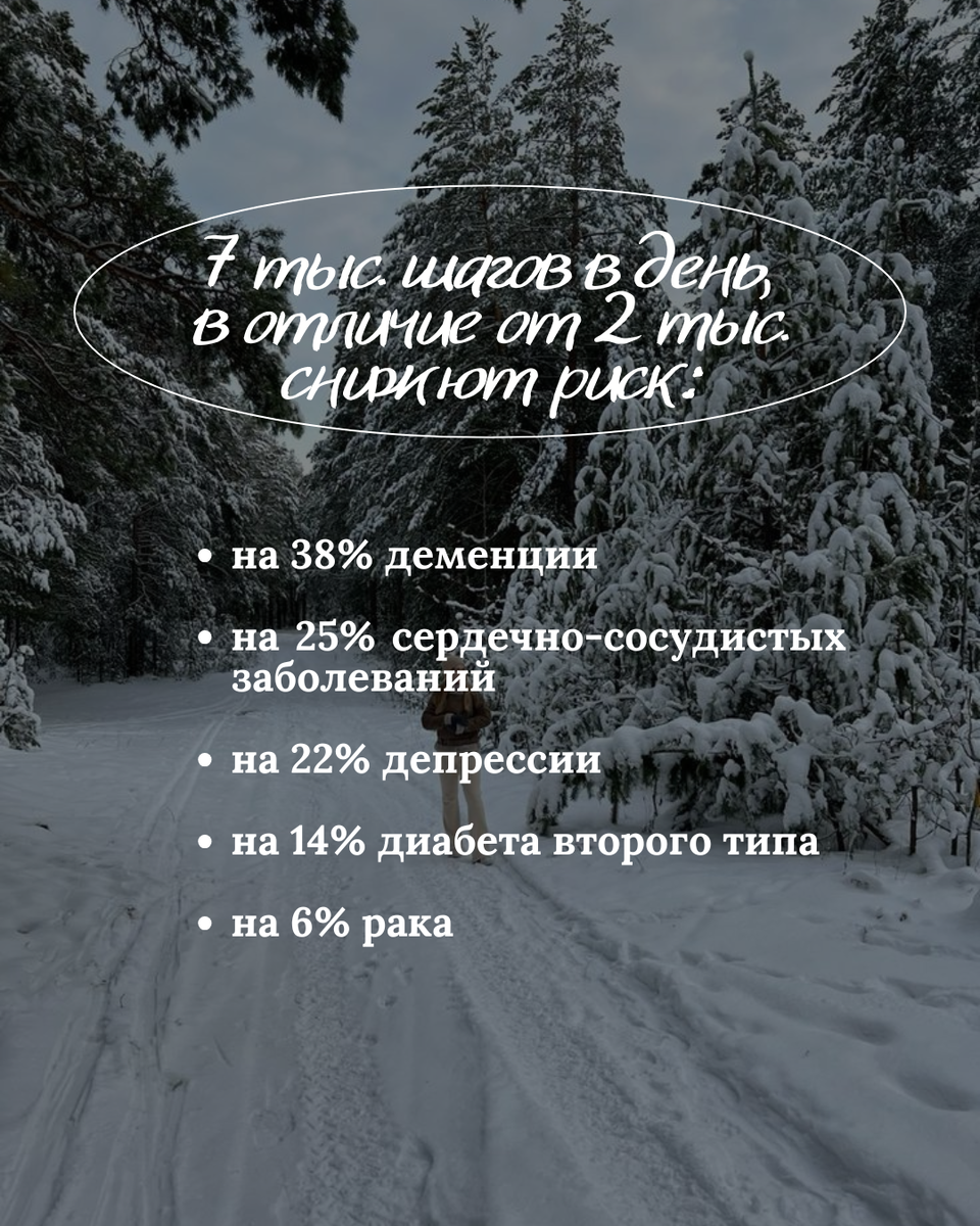 Оказывается, золотой стандарт в 10 тысяч шагов - никогда не был результатом медицинских исследований. Это гениальный маркетинг еще 1964 года. К Олимпиаде в Токио выпустили шагомер «Манпо-кей», в дословном переводе означает «счетчик 10 000 шагов». Когда появились уже электронные фитнес-трекеры, цифра 10 тыс. распространилась повсеместно и никто особо не ставил ее под сомнение. А потом уже начали проводить исследования. 🤩Что говорит наука в 2026 году? Свежее исследование в Lancet Public Health (анализ данных 160 тыс. человек за 10 лет!) расставило всё по местам (смотрите фото к посту). Исследование не только фокусировалось на здоровье сердца и факторах преждевременной смертности, но и отвечало на вопрос, как число пройденных шагов коррелирует с риском развития ряда заболеваний. Итак: 📌7 тыс. шагов (или 6 км) — это примерно около часа или полутора неспешной прогулки. 📌Стоит отметить, что фитнес-трекеры неспроста интересуются вашим ростом: шаг высокого человека будет шире, чем у более