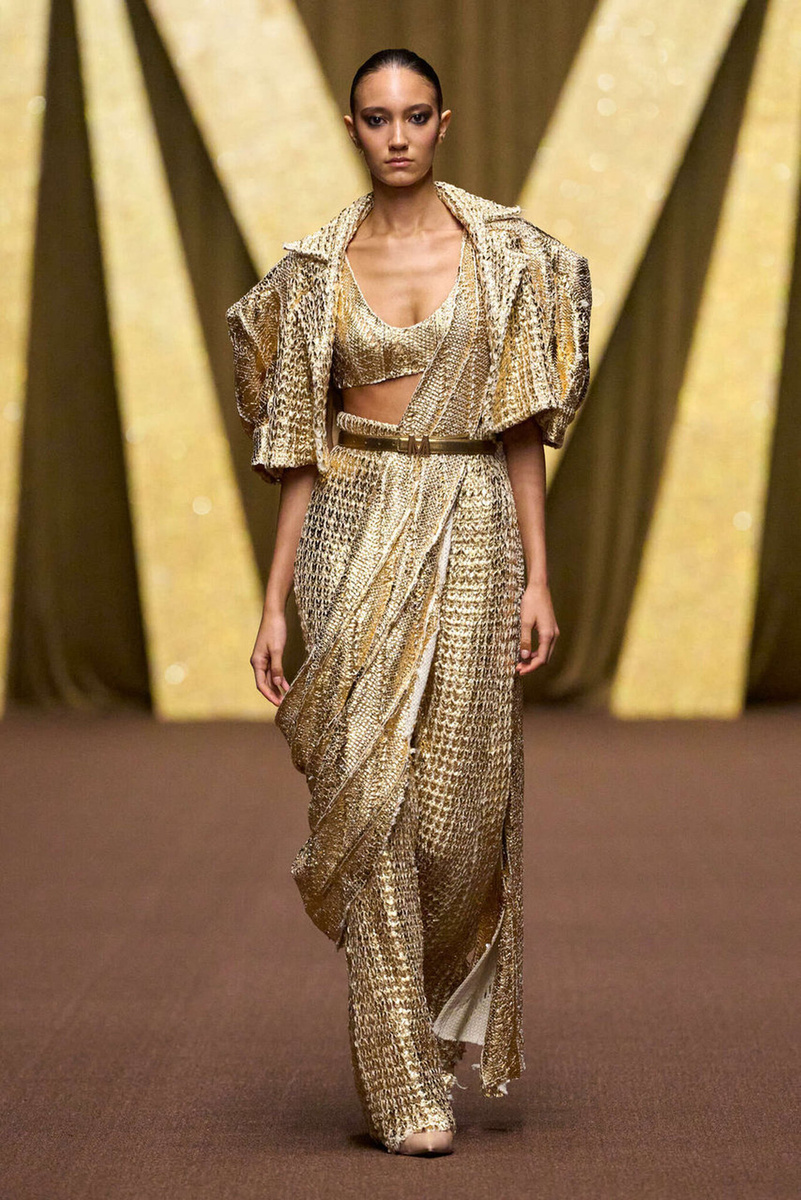 Традиционные индийские техники здесь не выглядят музейными. Они живут в современных силуэтах, в движении, в подаче. На подиуме — расшитые пайетками и парчой наряды, бисер, жемчуг, сложные фактуры. Но при всей роскоши образы не кажутся тяжёлыми. Это кутюр, который дышит и светится. Финал, который запомнился Кульминацией пок