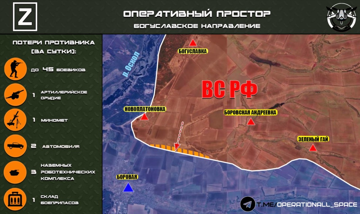 п. Новоплатоновка. 🔻Подразделения #1_танковой_армии ГВ «Запад» продолжают активно уничтожать огневые средства противника на западном берегу реки Оскол. Оперативный простор Карта носит ориентировочный характер и может быть скорректирована по мере поступления новых данных.