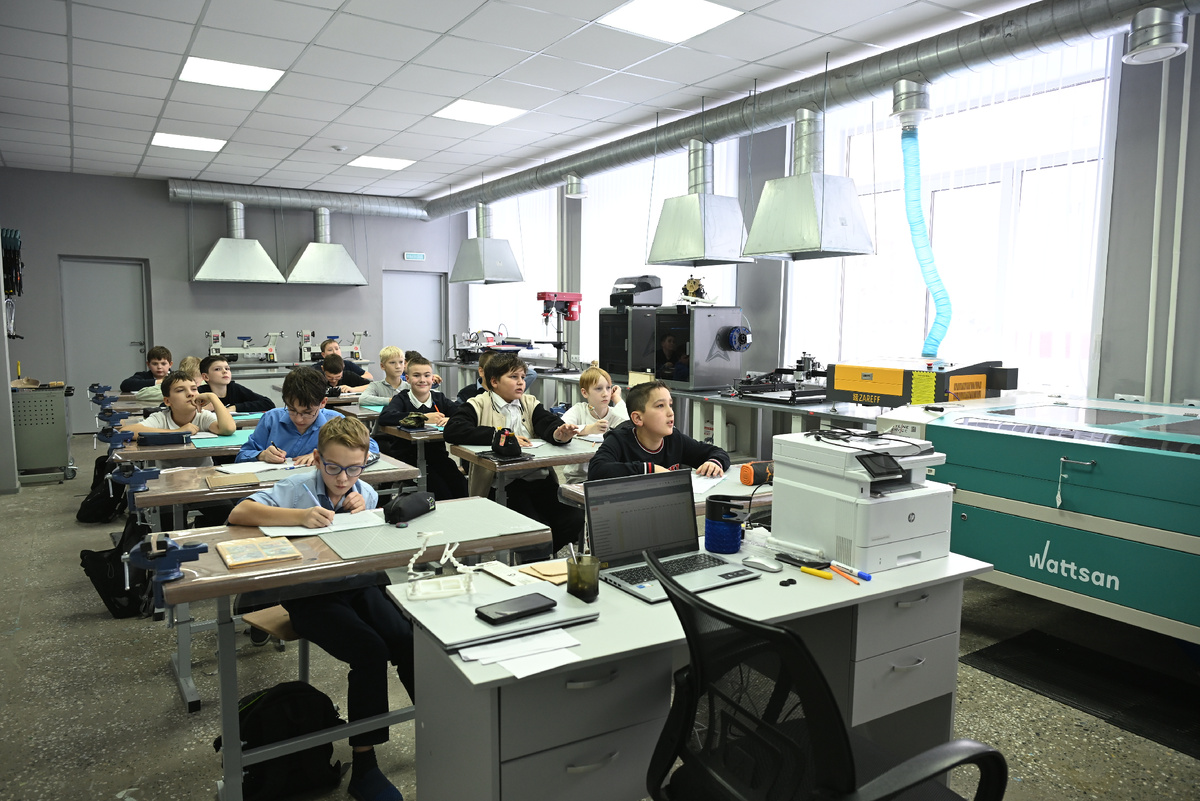 Уже на этапе планирования администрация школы понимала, что понадобятся ноутбуки, цифровые панели, два мощных компьютера, с помощью которых можно моделировать и конструировать. Появились также два современных лазерных станка, где происходит точечная резка и гравировка металлов, два фрезерных станка для обработки дерева и пластика, два современных 3D-принтера для изготовления сложных объемных деталей. Деревообработка для традиционных уроков труда.