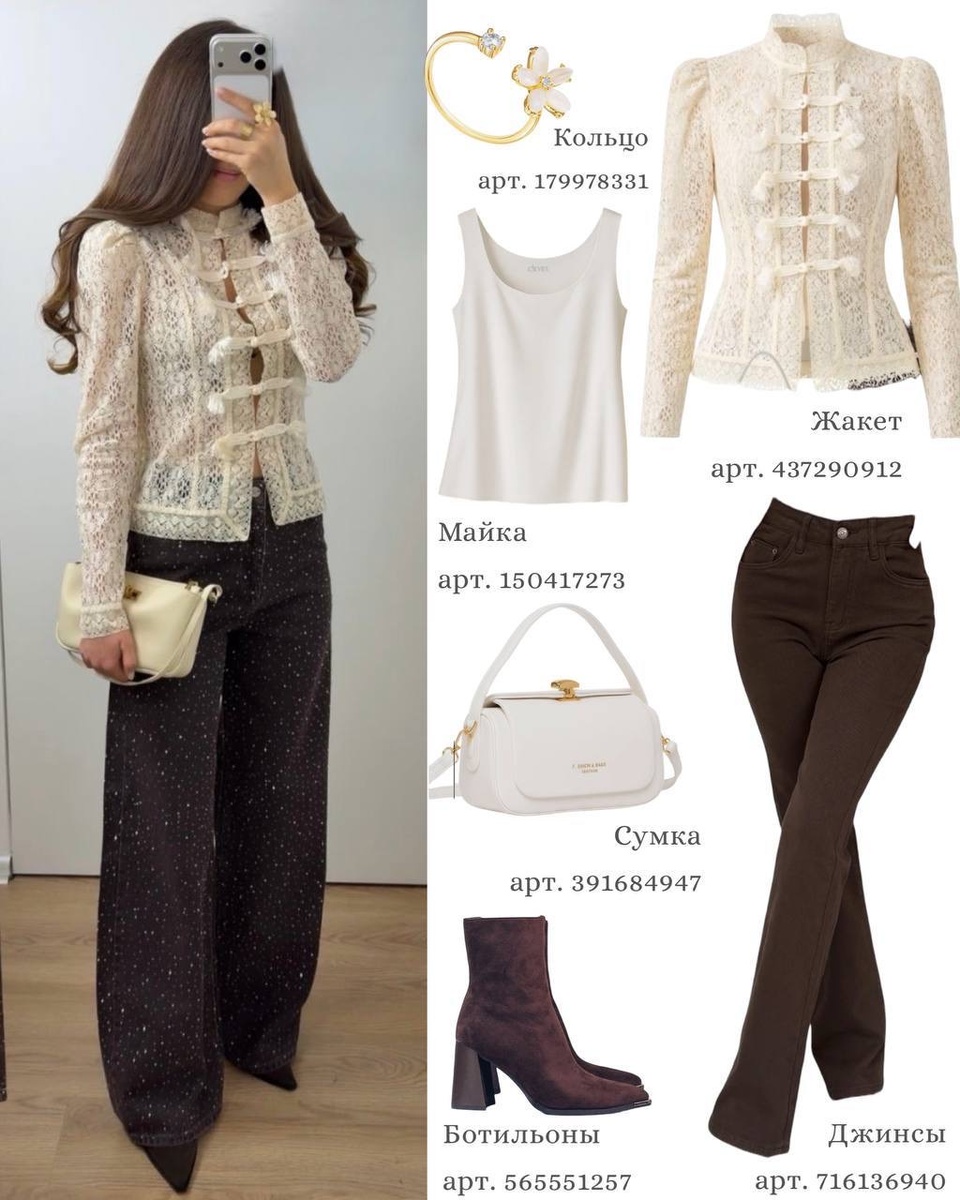 Тёмные брюки спокойного кроя становятся идеальной базой для акцентного верха. Кружевной жакет или блуза добавляют образу утончённости и визуальной лёгкости, создавая красивую игру фактур. Такой ансамбль выглядит дорого и деликатно, особенно в сочетании со светлой сумкой и обувью на устойчивом каблуке.