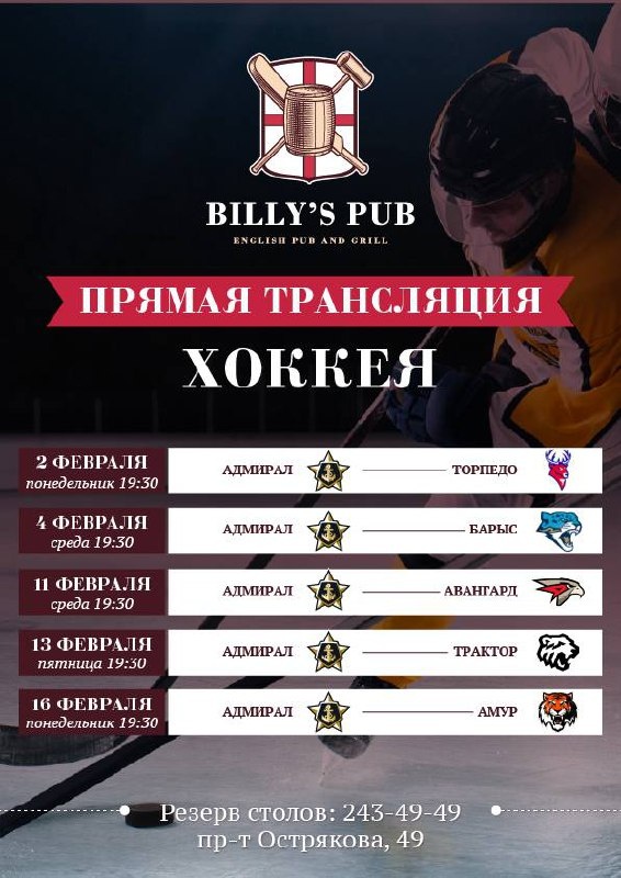 ? Сегодня в @BILLY’S PUB пройдет прямая трансляция захватывающего матча хоккейной команды "Адмирал" против "Авангарда"! Приглашаем вас наслаждаться игрой в уютной атмосфере нашего паба, где вас ждут 50 видов пива 🍻 и вкусная кухня 🥩 Смотреть матч в компании таких же преданных болельщиков и уютной атмосфере паба — это гораздо лучше, чем стоять в пробках! Не упустите возможность! Забронируйте столик уже сейчас и проведите вечер, наполненный эмоциями и азартом! Бронирование столов: ☎️243-49-49 📞+7 984 198-49-49 📍Пр-кт Острякова 49