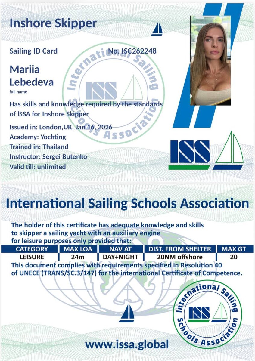⚓️ И вот ещё одна цель на 2026 год — выполнена ✅ В январе я прошла обучение и получила две международные лицензии ISSA: ▫️ Inshore Skipper — капитанская квалификация ▫️ Short Range Operator — лицензия на морскую радиосвязь и действия в экстренных ситуациях Что это значит на практике? Теперь я имею право самостоятельно управлять парусной яхтой длиной до 24 метров и выходить в море на расстояние до 20 морских миль от берега (≈37 км). И это не просто «поплавать». Это: — навигация и прокладка маршрута — работа с погодой, ветром и течениями — маневрирование и швартовка — управление экипажем — безопасность людей на борту — радиообмен и протоколы экстренной связи Фактически — полная ответственность за судно и команду. И отдельный факт, который меня очень вдохновляет: по мировой статистике, женщины составляют всего около 2–5% от всех лицензированных капитанов🥹 Осознавать себя частью этих процентов — очень сильное ощущение. Ещё в начале года это была просто строчка в списке целей. А