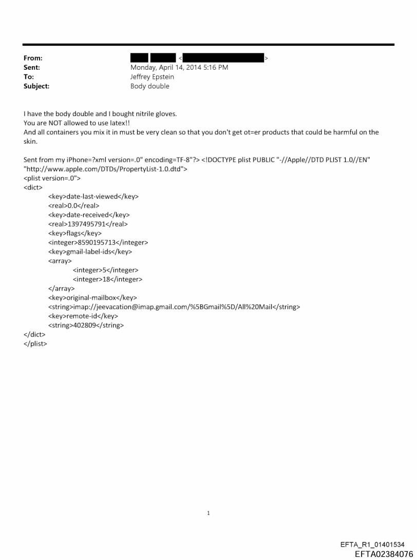 Epstein email from 2014 mentions ‘BODY DOUBLE’ and gloves