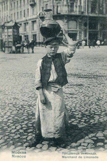 В XIX веке уличные торговцы — шныряли по площадям, дворам и окраинам, пробирались с чёрного хода прямо в квартиры, доставляя всё необходимое к порогу горожан. Они предлагали широчайший ассортимент: экзотические фрукты вроде «испанских вишен» (вероятно, сорт «Шпанка») и «лимоноподобных пельцинов» (экзотические цитрусовые вроде цитрона), сладости, яйца, свежие овощи по сезону, маринованные сливы, квашеные яблоки, жареные орехи, мед, рыбу солёную или свежую, горячую птицу, булки и пирожки, живых раков, горох в рассоле, икру, гречку с маслом, сигары, игрушки для детей, платки, ленты, обувь, сорочки, горячий сбитень, квасы и лимонады ярких ядовито-жёлтых или малиновых оттенков — короче, всё, что только могло прийти в голову. Такая торговля требовала огромных физических усилий: тяжёлые ящики с товаром приходилось носить весь день. Обычно это был массивный деревянный поднос прямоугольной формы с бортиками, накрытый тканью или тиковым чехлом, который несли на голове. Чтобы не повредить голов