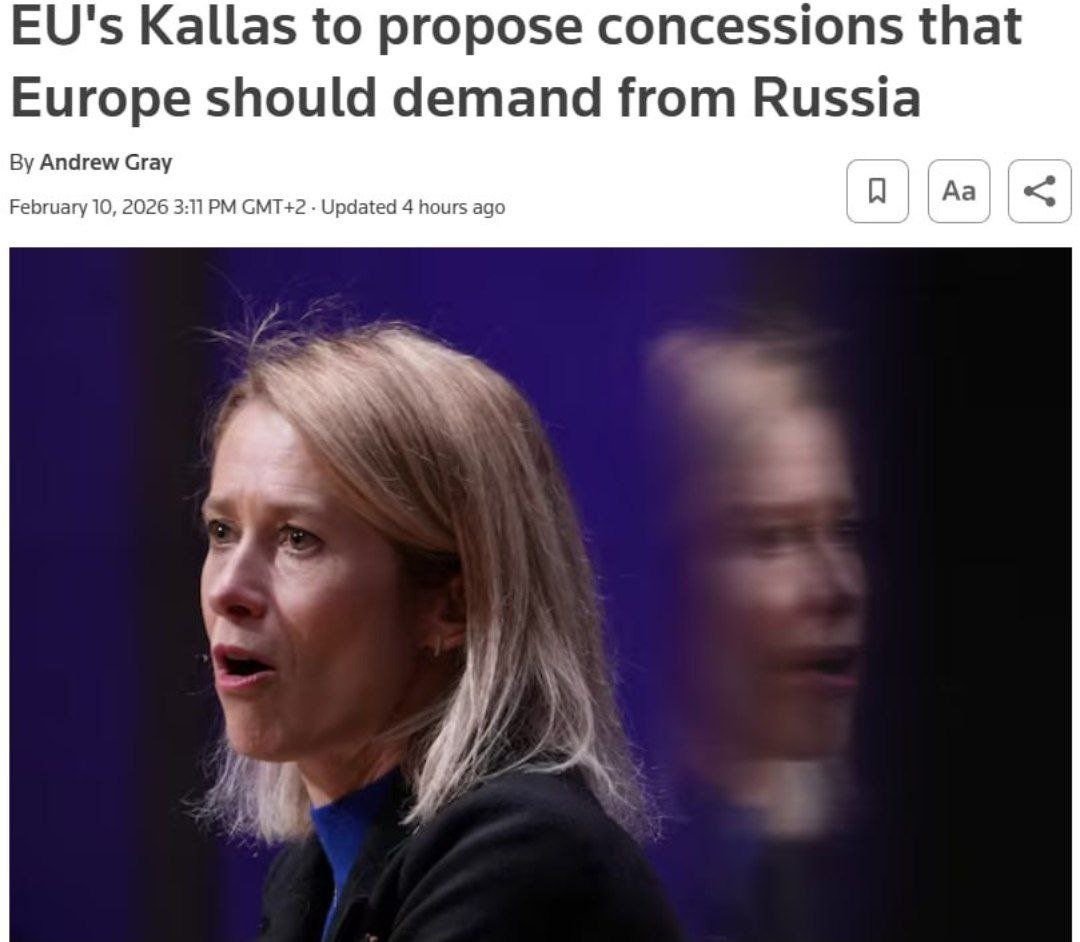 Как сообщает Reuters, главный дипломат ЕС Кая Каллас заявила, что подготовила перечень уступок, которые Европа будет требовать от России в ходе мирных переговоров. Среди прочего, это ограничение численности армии. При том, что Европу даже не допустили до российско-украинских переговоров в Абу-Даби. Как и где она собирается высказывать свои требования, Кая Каллас не пояснила. 🌐 За Русский Мир©Резервный📣Наш Чат✔️Подпишись‼️