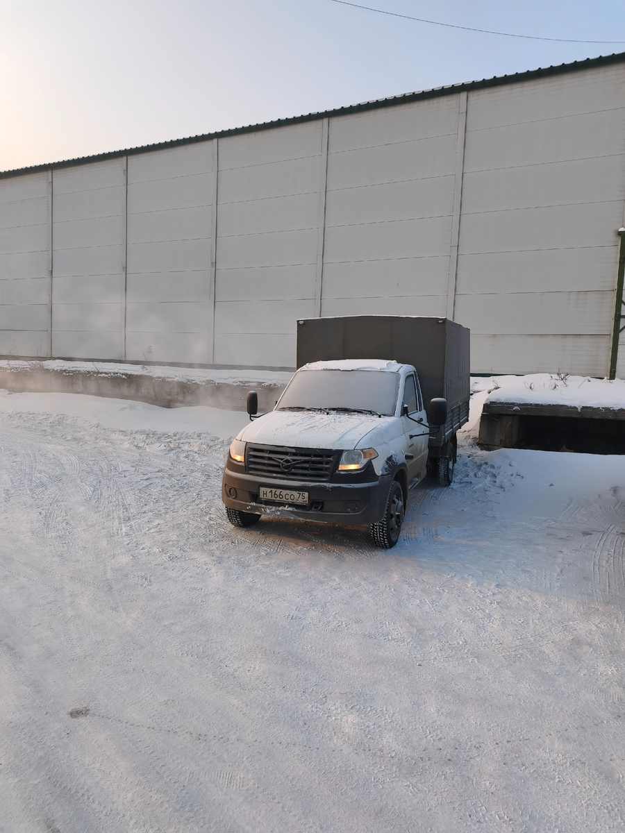 Здравствуйте! На фотографии мой работяга УАЗ Профи Полуторка с двухскатным задним мостом 2023 года выпуска, перед запуском двигателя с утра по морозу в минус 45 градусов.