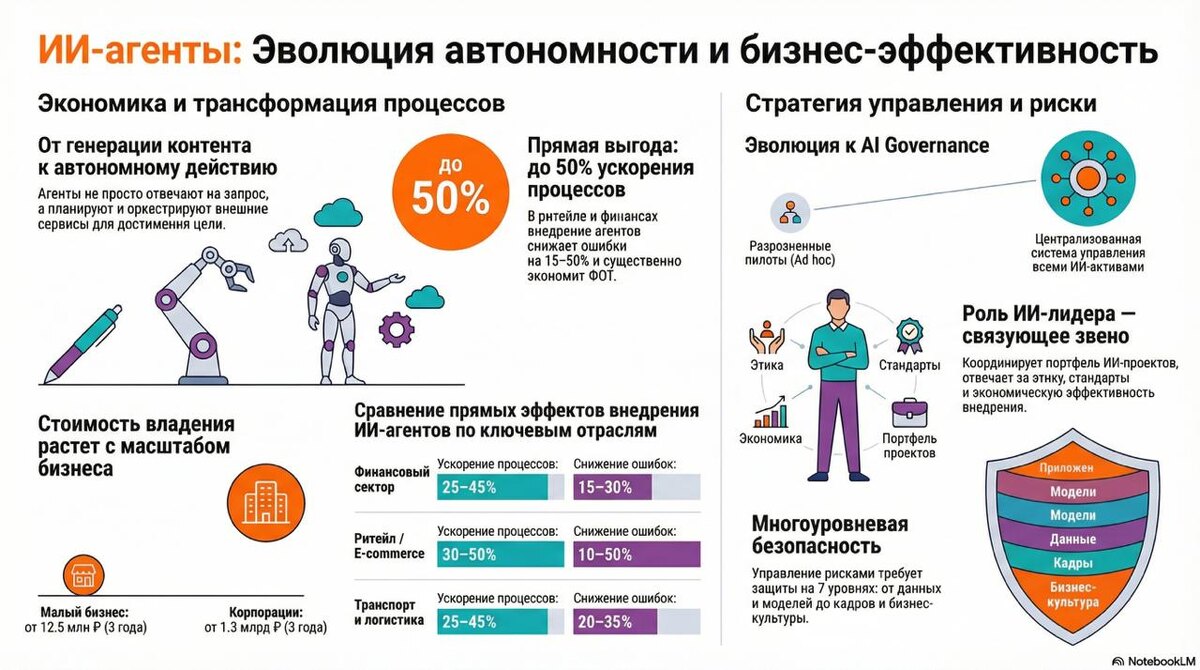 ПРИШЛО ВРЕМЯ НАНИМАТЬ ИХ НА РАБОТУ Пока рынок учится писать правильные промпты для ChatGPT, игра уже изменилась. Генеративный ИИ — это вчерашний день. На сцену выходят ИИ-агенты. В чем разница? Генеративный ИИ отвечает на вопросы. ИИ-агент ставит цели, планирует и делает. Это не просто «умный чат-бот». Это автономный субъект, который может сам забронировать логистику, провести аудит кода или выстроить воронку продаж, корректируя свои действия по ходу пьесы. Почему это касается тебя прямо сейчас? 📉 Цифры не врут: Доля России на рынке ИИ-агентов — всего 1,5% (против 30% у США). Это значит, что ниша пуста. У тебя есть шанс стать первым в своей отрасли, кто внедрит «цифровых сотрудников», а не просто инструменты. Но входной билет стоит денег. Аналитики Axenix и МГУ подсчитали цену вопроса на 3 года: • Малый бизнес (~50 чел): ~12,5 млн руб. • Средний бизнес (~500 чел): ~275 млн руб. • Корпорации: ~1,3 млрд руб. Дорого? А теперь посмотри на ROI: в ритейле и логистике ускорение процессов до
