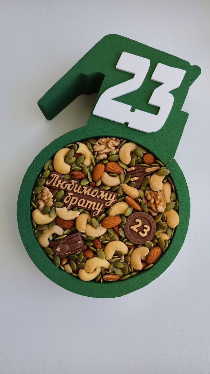 На дне орешки грецкие и пекан в скорлупе, сверху ассорти ореховое и шоколад ручной работы.