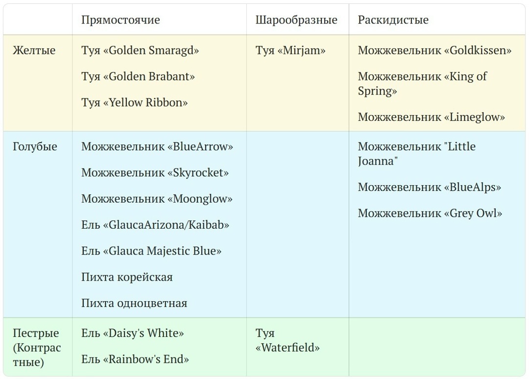 Даже в зимние месяцы сад будет радовать Вас разнообразием цвета, если Вы посадите в нем хвойные растения с золотистой, голубоватой и пестрой/контрастной хвоей. Создайте уникальный ландшафт, комбинируя хвойные растения разных форм, цветов и ярусов ЖЕЛТЫЕ ХВОЙНЫЕ Туи Golden Smaragd, Golden Brabant, Yellow Ribbon можно использовать как центр композиции, создать яркую изгородь или разбавить ими монотонность зеленой, оттенить задний план сада из, например, высоких елей или пихт. Туя Mirjam придаст своей округлой формой законченность садовому дизайну. Декоративной стрижкой туй вы предадите своему саду уникальный вид. Можжевельники Goldkissen, King of Spring, Limeglow станут ярким акцентом на зеленом фоне. Идеальное место посадки - солнечное или слегка полутенистое. Полное солнце усиливает яркость жёлтой хвои, в тени интенсивность окраски снижается. ГОЛУБЫЕ ХВОЙНЫЕ Можжевельники Blue Arrow, Skyrocket, Moonglow станут отличной вертикальной доминантой, но необходимо учитывать, что если высота у