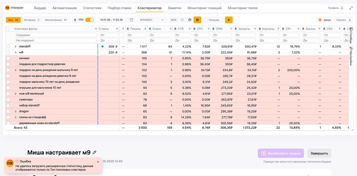 кликам и показам по всем фразам, даже если по ним нет 100 показов и используются для кластеризатора. В новом обновлении сделали что если за 20 секунд не удалось получить полную статистики по фразам, то кластеризатор открывается с данными из Топ поисковых кластеров и Джема. В большинстве случаев этого достаточно для минусации кластеров и корректировки ставок. Для ручного обновления плагина вот инструкция по обновлению: https://telegra.ph/Kak-obnovit-rasshirenie-mkeeper-02-06 И заходите на эфир в 13.00 (пост выше), там я затрону тему ограничений от вб и как минимизировать их в своей работе