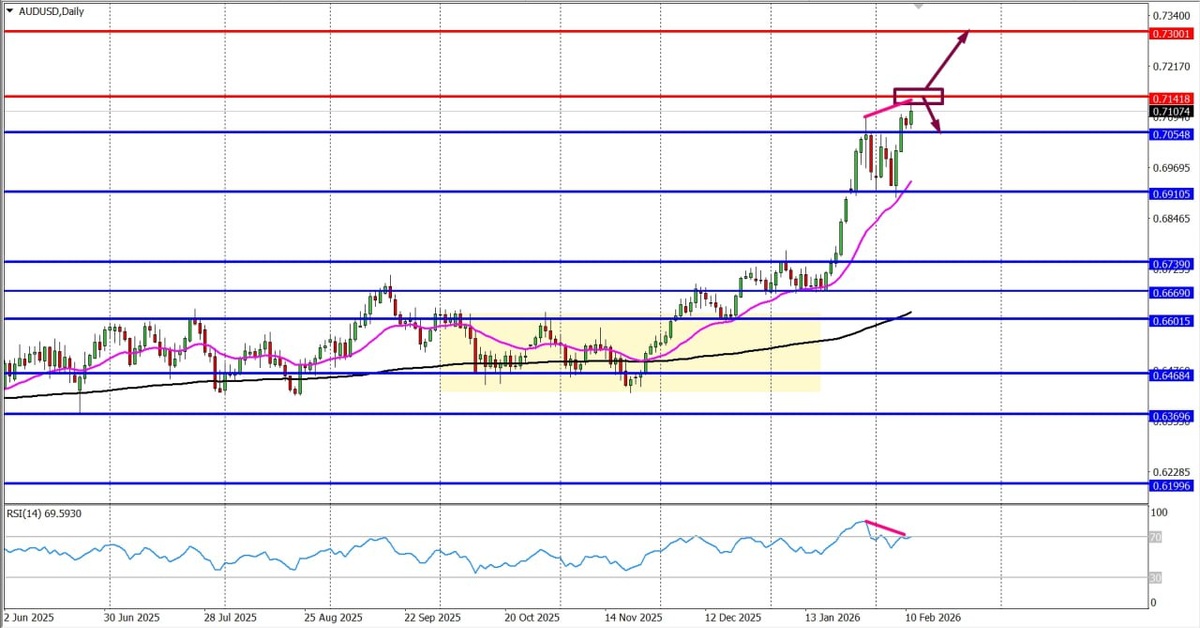 В прошлом посту я писал, что ожидаю развития коррекции в область уровня 0.6913, а от этого уровня буду смотреть покупки до 0.7055. На этой неделе цель в области 0.7055 была достигнута. Цена пробила уровень вверх и закрепилась. Следующей целью роста является максимум 2023 года в области 0.7141. На позитивных новостях по экономике Австралии покупатели могут достигнуть этой цели на текущей неделе. Также росту способствует то, что доллар США инвесторы топят. За неделю бакс потерял уже 1,10%. Негативная статистика по розничным продажам, ожидания пересмотра данных по занятости за год и ухудшение ожиданий в отношении ставки ФРС - это те факторы, которые толкают цену DXY вниз. Следовательно, по AUD выгодно либо удерживать часть покупок до 0.7141, либо закрывать все и переходить в фазу ожидания. Да, тренд восходящий, но цена подходит к сильным уровням. По RSI формируется дивергенция. Отклонение от средних уже достаточно велико. Я предпочитаю посидеть в сторонке после недавней прибыли. #AUDUSD