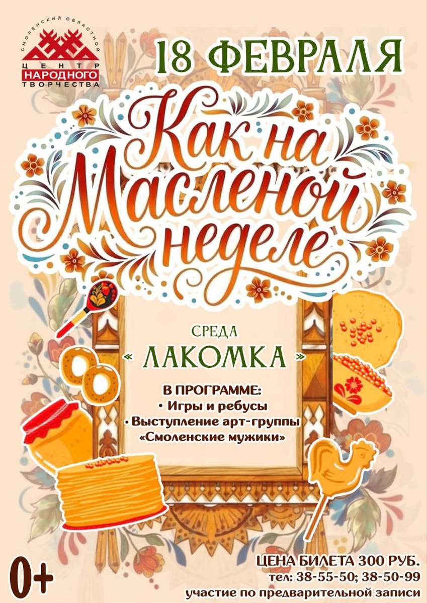 ! 😋 🥞Масленица — это не просто прощание с зимой, а настоящий праздник тепла, щедрости и семейных традиций. 🌞18 февраля вас ждут весёлые забавы, музыкальное настроение и неповторимая атмосфера русского гуляния. В программе: 🌝 игры и ребусы, где вы сможете проверить свою смекалку и зарядиться позитивом в дружеской компании; 🌝 яркие музыкальные номера в исполнении арт‑группы «Смоленские мужики» согреют сердце и создадут праздничное настроение. ❗️Участие по предварительной записи и по набору групп. ❗️Цена билета: 300 руб. 📍Адрес: ул. Бакунина, 3 ☎️Телефоны: 38-55-50, 38-50-99. #СмоленскийЦентрНародногоТворчества