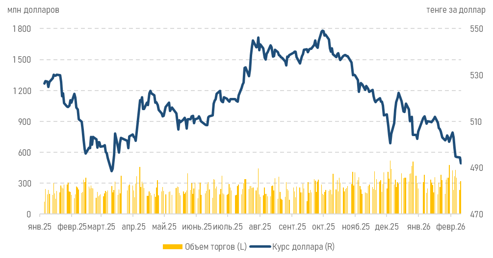 Обзор рынков подготовили аналитики Ассоциации финансистов Казахстана (АФК). На торгах вторника нацвалюта продемонстрировала укрепление шестую сессию подряд на фоне приближения старта февральского налогового периода и более высоких цен на нефть. По итогам дня средневзвешенный курс по паре USD/KZT опустился до отметки 491,89 тенге за доллар (-2,63 тенге) при среднем объеме торгов – 318,9 млн долларов (+86,5 млн долларов). Укрепление курса при таком объеме торгов может сигнализировать об увеличении предложения инвалюты на рынке. Из опубликованной статистики отметим, что валовые международные резервы Национального банка в январе выросли на 9,4% – до 71,6 млрд долларов. Это связано с ростом портфеля золота до 55,3 млрд долларов (+17,1%). Однако активы в СКВ, включающие средства БВУ на счетах и депозитах в НБРК, снизились до 16,3 млрд долларов (-10,6%). В совокупности международные резервы страны, включая активы Нацфонда в инвалюте (64,7 млрд долларов), на начало февраля составили 136,3 млрд