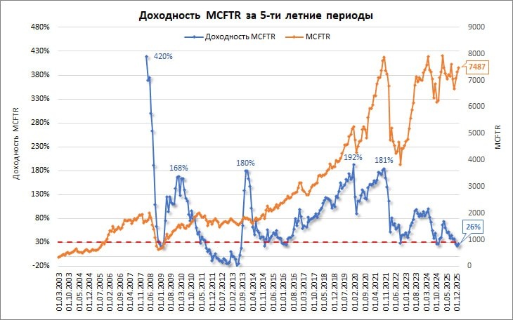 Доходность акций по индексу #MCFTR (IMOEX с реинвестированными дивидендами без учета налога) за 5-ти летний период c момента последнего обзора в мае прошлого года сократилась с 60% до 26% на конец января 2026, пишет Сергей Стаценко. Инвестиции в облигации оказались доходнее: индекс совокупного дохода 1-3-летних гособлигаций (RUGBITR3Y) за этот период прибавил 44%. 5-ти летняя доходность MCFTR на конец января 2026 приблизилась к уровню поддержки 30%, с которого два раза индекс показал высокую доходность в 2008 и 2016 гг. На этот раз, скорее всего, будет провал в доходности, как это было с середины 2011 по середину 2013 Акции все еще остаются непривлекательным активом для долгосрочных инвесторов, которые наблюдают угасающую доходность своих портфелей. Статистику не обманешь: акции находятся в тренде меньшую часть времени, большую часть занимают боковики и неопределенность. Хотя акции и считаются инструментом для долгосрочных инвестиций, но для того, чтобы приумножить капитал нужно зах