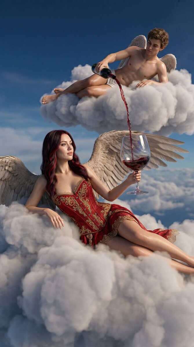: Поделюсь со всеми 💋 Фотореалистичная сюрреалистичная сцена. В небе среди плотных, объёмных облаков лежит огромная девушка-купидон. Она полулежит на боку на облаке, опираясь на одну руку. На ней пышное корсетное платье с золотыми вставками, сложная конструкция ткани, хорошо читаемая фактура. Цвет платья (розовый или бургундия или насыщенный красный). Большие детализированные крылья частично расправлены за спиной. В другой руке она держит большой бокал, стекло прозрачное, с бликами и отражениями неба. Выше, на другом облаке, расположен мужчина-купидон. Он лежит расслабленно и льёт красное вино из бутылки в её бокал. Поток вина чётко виден в воздухе, жидкость ведёт себя физически правдоподобно. Его крылья и тело также реалистичны, без декоративной мультяшности. Кожа обоих персонажей гиперреалистичная. Видны поры, естественные цветовые переходы, лёгкий загар, микроблеск на плечах и ключицах. Вес тел ощущается. Облака слегка деформируются под ними, не выглядят иллюстративными. Фон. Крас
