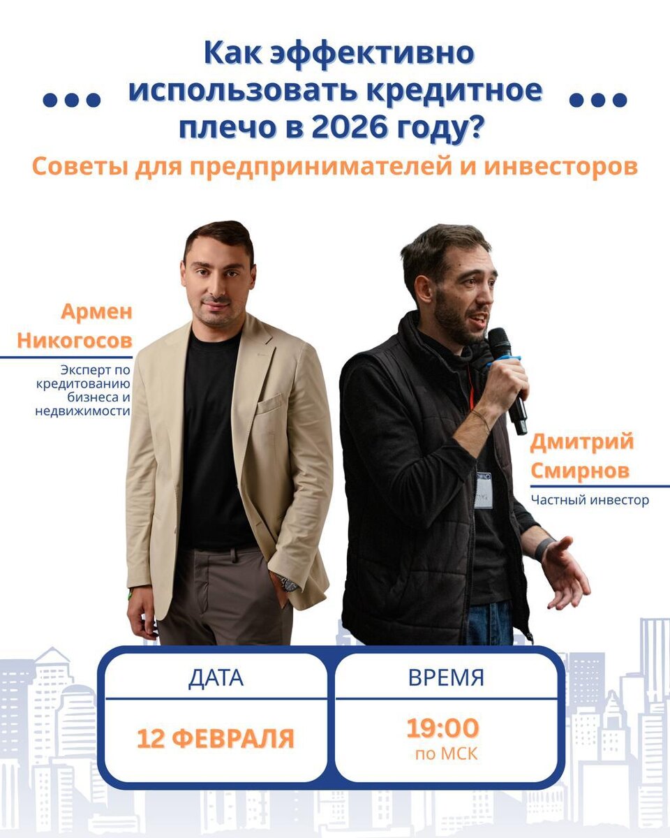 ? На прошлой неделе был на мероприятии, там рассказали о программах, где банки готовы кредитовать покупку готового арендного бизнеса (ГАБ) и делать так, чтобы платеж был равен сумме денег от арендатора. Формально достаточно просто собрать на первоначальный взнос и найти объект с доходностью +-16% годовых. Решил разобраться в этом подробнее и пригласил своего знакомого Армена Никогосова провести совместный эфир. Тема: «Как эффективно использовать кредитное плечо в 2026 году? Советы для предпринимателей и инвесторов» Гость является владельцем компании Ипотека+, на рынке все профессиональные игроки с ним знакомы и многие пользовались услугами. Рассмотрим, какие программы доступны в этом году. Разберём на примерах, в каких ситуациях кредитное плечо выгодно, а в каких стоит рассмотреть альтернативу. Встреча будет 12-го февраля в 19:00 по Москве. Эфир проведем в зуме, ссылку выложу за 10 минут до старта. 📍Смирнов Дмитрий | Опыт инвестора