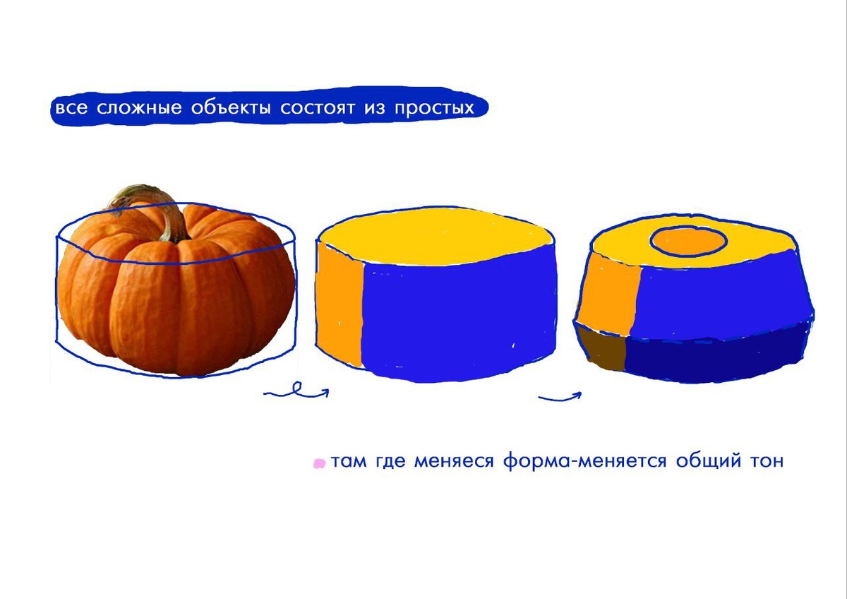 - многосоставные объекты ─ почти все овощи, например тыква и перец с наших картинок, внутри общей формы имеют сегменты, на каждом из которых будет своя падающая и собственная тени, а они в свою очередь подчиняются общей светотени объекта