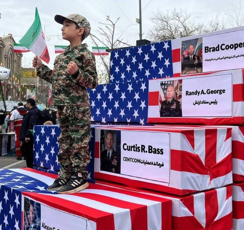 Символические гробы нескольких американских военных лидеров во время юбилейного парада в честь победы революции в Тегеране, Иран.