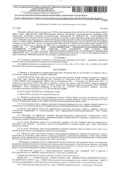 м, кадастровый номер 31:16:0115008:421. Имущество обременено: арест, запрещение регистрации. Имущество принадлежит на праве собственности ООО КПП «Сервис». Основание реализации: постановление о передаче арестованного имущества на торги от 25.11.2025 №98031/25/171922 СОСП по Белгородской области Канал: Госземля Белгородская область Область: обл Белгородская Белгородская область Район: г. Белгород Населенный пункт: ул. Везельская, 142а Локация: Смотреть на карте ВРИ: Иной вид Кадастровый номер: 31:16:0115008:421 Кадастровая стоимость: - Вид сделки: Продажа Площадь: 11 м² Начальная цена: 182719.00 руб. Дата завершения: 12.03.2026 Подробнее: ГИС ТОРГИ #госземля #земляотгосударства #земля #земельныйучасток #земельныеторги #торги #аукцион #продажаземли #продажа #белгородскаяобласть