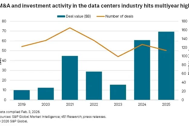 S&P Global: объем сделок M&A в сфере дата-центров превысил 69 млрд долларов в 2025 году, а «neoclouds» оказались в «незавидном положении»