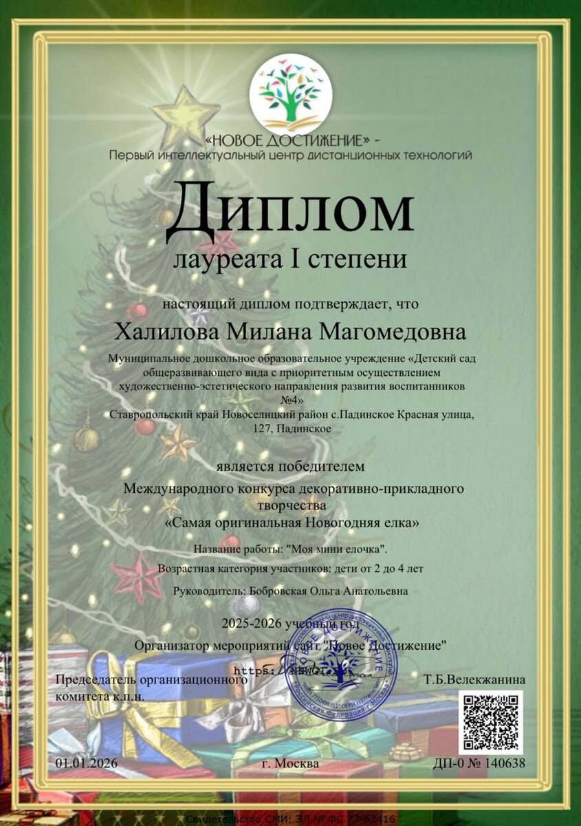 За взрослыми ребятами тянутся и наши малыши. Интеллектуальным центром дистанционных технологий «НОВОЕ ДОСТИЖЕНИЕ» проводился международный конкурс декоративно-прикладного творчества «Самая оригинальная Новогодняя ёлка». В возрастной категории от 2 до 4 лет победителем стала воспитанница нашего детского сада № 4 ХАЛИЛОВА МИЛАНА МАГОМЕДОВНА! Руководитель направления: Бобровская Ольга Анатольевна. Следим за развитием наших детей уже с детского сада и будем стараться удержать их на такой же активной позиции. А сегодня поздравляем с победой Падинский Детский сад № 4 «Солнышко»!!!