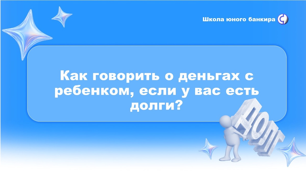 Привет, друзья! 👋 Школа юного банкира знает, как важно воспитывать финансовую грамотность у детей. Но что делать, если в семье есть финансовые трудности, в частности – долги? Как говорить об этом с ребенком, не вызывая у него тревоги и не подрывая веру в будущее? Сегодня мы поделимся советами психолога и лайфхаками, которые помогут вам наладить открытый и доверительный диалог. Предлагаем вам челлендж! На этой неделе составьте вместе с ребенком простой семейный бюджет на неделю. Запишите все доходы и расходы. Обсудите, где можно сэкономить и куда направить сэкономленные деньги. Мы заботимся о ваших детях и хотим помочь вам воспитать финансово грамотное поколение! Если у вас есть вопросы, не стесняйтесь задавать их в комментариях! 👇 💖 Если этот пост был полезен, ставьте лайк и сохраняйте, чтобы не потерять! 😉 ✅ Оформите стикер Халвау: https://kids.halvacard.ru/#get