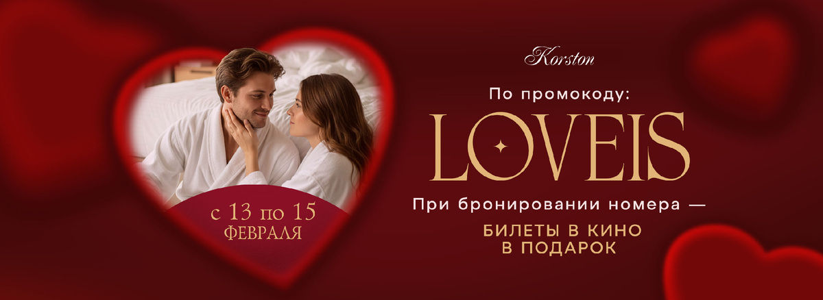 14 февраля хочется окружить себя любимыми, создать атмосферу уюта и романтики. «Корстон Серпухов» подготовили для вас приятные сюрпризы, чтобы этот день запомнился! Хотите сделать свой День Всех Влюблённых по-настоящему особенным? Бронируйте номер в отеле «Корстон» Серпухов с 13 по 15 февраля по промокоду LOVEIS — и получите билеты в кино в подарок!