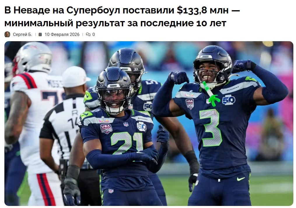 Согласно отчету регулятора, объем ставок в букмекерских конторах штата оказался самым низким за весь период после отмены федерального запрета на спортивные ставки в США. По данным комиссии, в 186 букмекерских конторах Невады на финальный матч между «Сиэтл Сихокс» и «Нью-Ингленд Пэтриотс» было принято $133,8 млн (≈ 12,3 млрд рублей). Победу в Супербоуле одержал «Сиэтл», выиграв со счетом 29:13. Финансовые итоги Супербоула в Неваде: общий объем ставок — $133,8 млн (≈ 12,3 млрд руб.); выигрыш букмекерских контор — $9,89 млн (≈ 910 млн руб.); маржа букмекеров — 7,4%. Сравнение с предыдущими годами Показатели 2026 года заметно уступают итогам прошлых Супербоулов: по сравнению с 2025 годом объем ставок снизился на 11,7% (тогда было принято $151,6 млн); относительно 2024 года, когда был зафиксирован рекордный показатель в $190,0 млн, падение составило почти 30%; текущий результат оказался ниже даже 2021 года, когда казино Невады работали с ограничениями из-за пандемии. Таким образом, обо