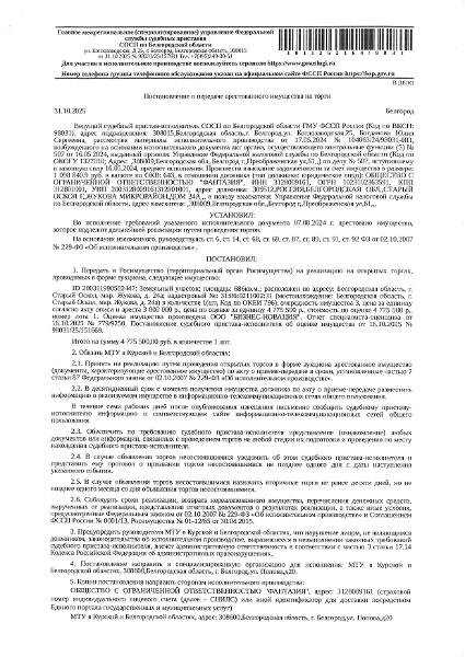 м, кадастровый номер 31:06:0211002:31. Имущество обременено: арест, запрещение регистрации. Имущество принадлежит на праве собственности ООО «Фантазия». Основание реализации: постановление о передаче арестованного имущества на торги от 31.10.2025 № 98031/25/157691 СОСП по Белгородской области Канал: Госземля Белгородская область Область: обл Белгородская Район: г.о. Старооскольский Населенный пункт: г Старый Оскол, мкр Жукова, дом 24а Локация: Смотреть на карте ВРИ: Иной вид Кадастровый номер: 31:06:0211002:31 Кадастровая стоимость: - Вид сделки: Продажа Площадь: 600 м² Начальная цена: 4059175.00 руб. Дата завершения: 12.03.2026 Подробнее: ГИС ТОРГИ #госземля #земляотгосударства #земля #земельныйучасток #земельныеторги #торги #аукцион #продажаземли #продажа #белгородскаяобласть