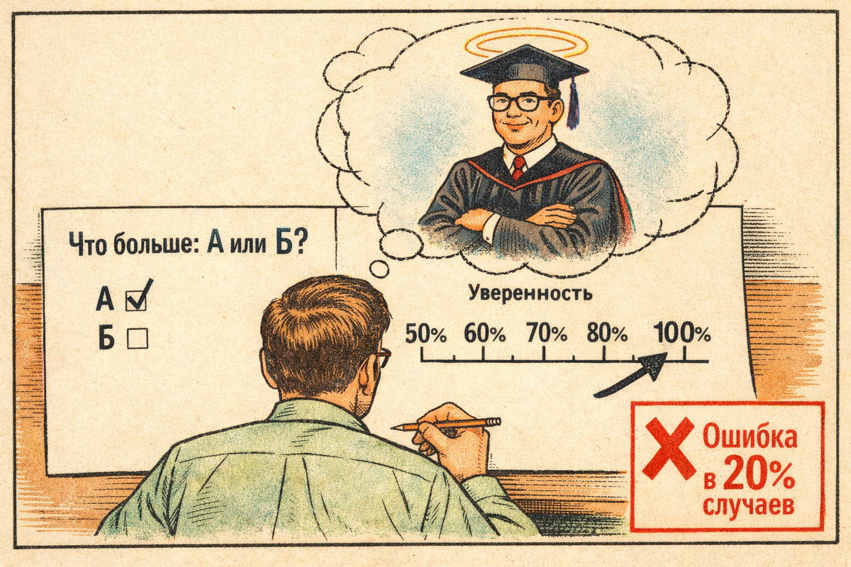 Результаты: когда человек заявлял, что уверен в ответе на все 100%, он все равно ошибался примерно в каждом пятом случае. А если его уверенность была на уровне 90%, то частота ошибок подскакивала до 40%!
