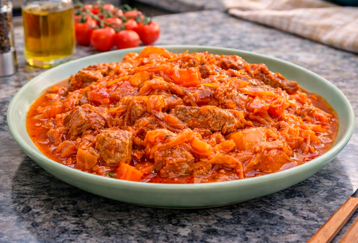 Приветствую вас, гурманы и любители приготовить что-нибудь из квашеной капусты! Ну, ясно из названия, что у нас будет не голимая квашеная капуста, а с говядиной. Потому что мы считаем, что эти два ингредиента очень хорошо подходят друг другу. Берем: Делаем: 1. Мясо промойте, обсушите бумажным полотенцем. Нарежьте на кубики примерно 3х3 см. Положите мясо в миску, добавьте муку и перемешайте. 2. В глубокой сковороде или казане разогрейте 3-4 ст.л. масла на среднем огне. Выложите туда говядину и обжарьте до карамельного цвета со всех сторон. Лучше жарить партиями. Переложите обжаренное мясо в миску. 3. Лук и морковь очистите. Лук нарежьте кубиком, морковь - некрупными брусочками или полукружиями. Перец очистите от семян и нарежьте аналогично луку. Чеснок пропустите через пресс или мелко порубите. 4. В ту же сковороду, где жарилось мясо, добавьте оставшееся масло и обжарьте лук до мягкости и лёгкой позолоты. Добавьте чеснок, обжарьте вместе около минуты. Убавьте огонь, всыпьте копчёную пап