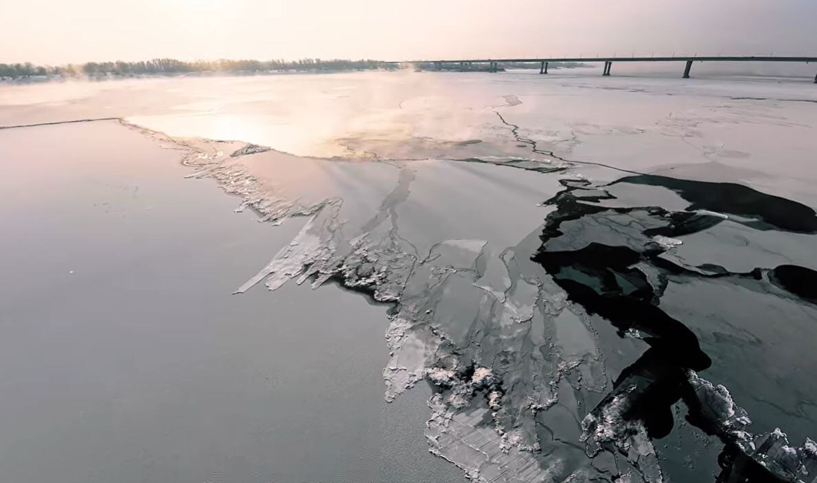 Камера пролетает над руслом реки в одном из самых широких ее мест. Узкой лентой среди льда извивается парящая на морозе лента иссиня-черной от холода воды. И кажется, что слышишь хруст ломающихся об опоры танцующего моста гигантских льдин.