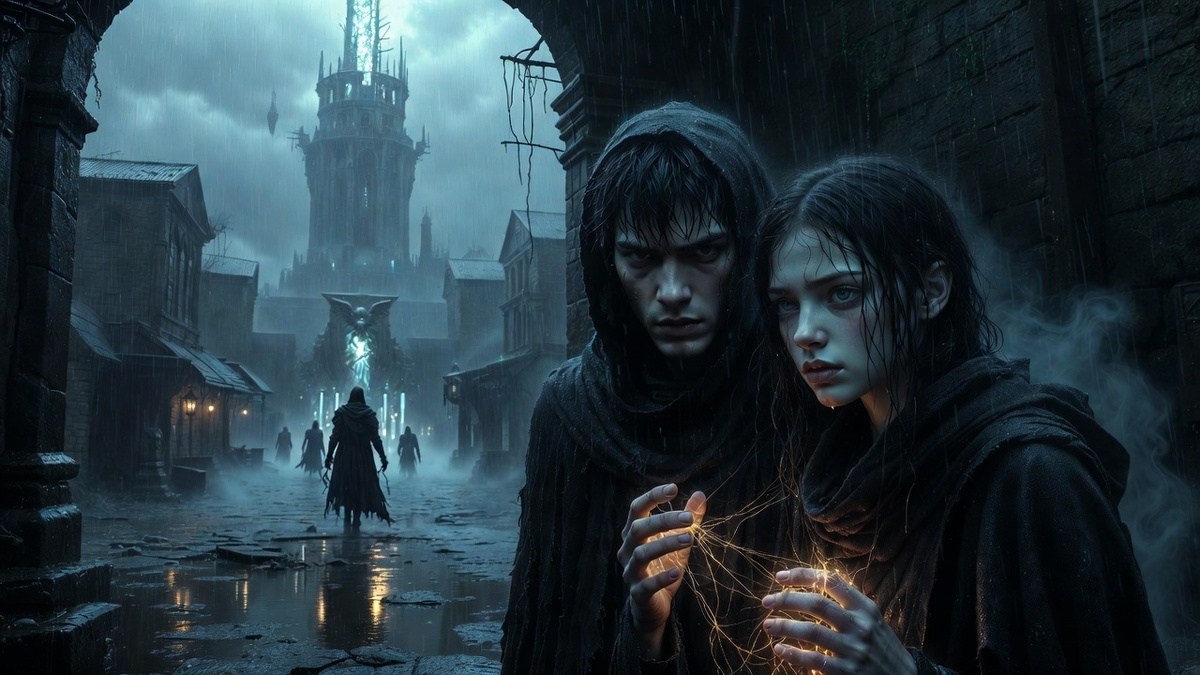 Они выбежали на лестницу - винтовую, каменную, ведущую вверх. Крыши. Арвей вела, потому что видела нити впереди: тонкие, серебристые, ведущие к безопасности. Но когда Кай делал шаг - нити дрожали, раздваивались, одна гасла, другая загоралась. Она выбирала вслепую, интуитивно, и каждый раз угадывала - или удача, или что-то другое.