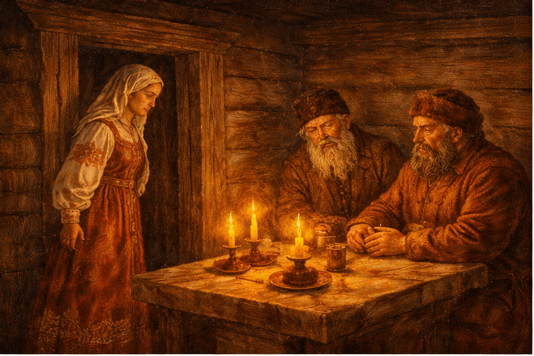 Вступление Если сватовство было осторожным началом переговоров, то смотрины становились первым реальным шагом к браку. Здесь уже не было иносказаний — стороны должны были увидеть друг друга и убедиться, что союз возможен. Смотрины и последующее рукобитье превращали предположение в договор. После этого пути назад почти не оставалось. Смотрины: оценка без слов Смотрины проходили в доме невесты. Жених и его родственники приезжали не только «посмотреть девушку», но и оценить хозяйство семьи, уклад дома, достаток и порядок. Невеста выходила скромно, с покрытой головой, в праздничной, но сдержанной одежде. Она не говорила много. Важны были не красноречие и улыбка, а осанка, здоровье, скромность и умение держаться. Жених, в свою очередь, также оказывался под наблюдением. Родители девушки оценивали его поведение, серьёзность и положение. Молчание как часть обряда В смотринах важную роль играло молчание. Невеста редко вступала в разговор. Считалось, что чрезмерная разговорчивость или смех могу