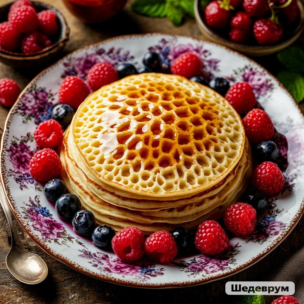 на среднем огне, пока края не подрумянятся, — переверните. Готово за 1–2 минуты с каждой стороны! 💡 Совет: блины получаются ажурными именно благодаря реакции соды с кипятком — не пропускайте этот шаг! Подавайте с маслом, сметаной, вареньем или заворачивайте в них начинку