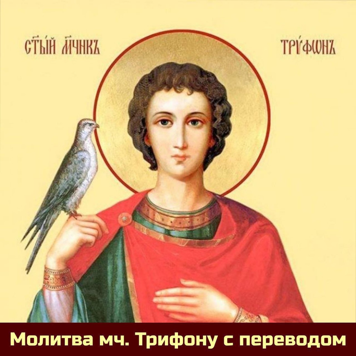 Перевод на русский язык: О, святой мученик Христов Трифон, скорый помощник и покровитель, внимающий всем к тебе прибегающим и молящимся перед святым твоим образом. Услышь ныне и во всякое время моление наше, недостойных рабов твоих, почитающих святую память твою и будь нашим покровителем перед Господом всюду. Потому, как ты угодник Христов, воссиявший великими чудесами, подающий исцеление всем с верой к тебе приходящим и скорбящих людей защищающий, сам дал обещание перед оставлением этой тленной жизни молиться за нас Господу и испросил у Него такой дар: если кто в какой-либо нужде, печали и болезни душевной или телесной начнет призывать святое имя твое, тот избавлен будет от всякого подступающего зла. И как ты в известное время дочь царя в Риме, мучимую диаволом, исцелил, так же и нас от его жестоких козней сохрани во все дни нашей жизни, особенно же в день нашей смерти будь нашим покровителем. Будь в тот день нашим помощником, изгоняющим злых духов и ведущим нас к Царству Небесному.