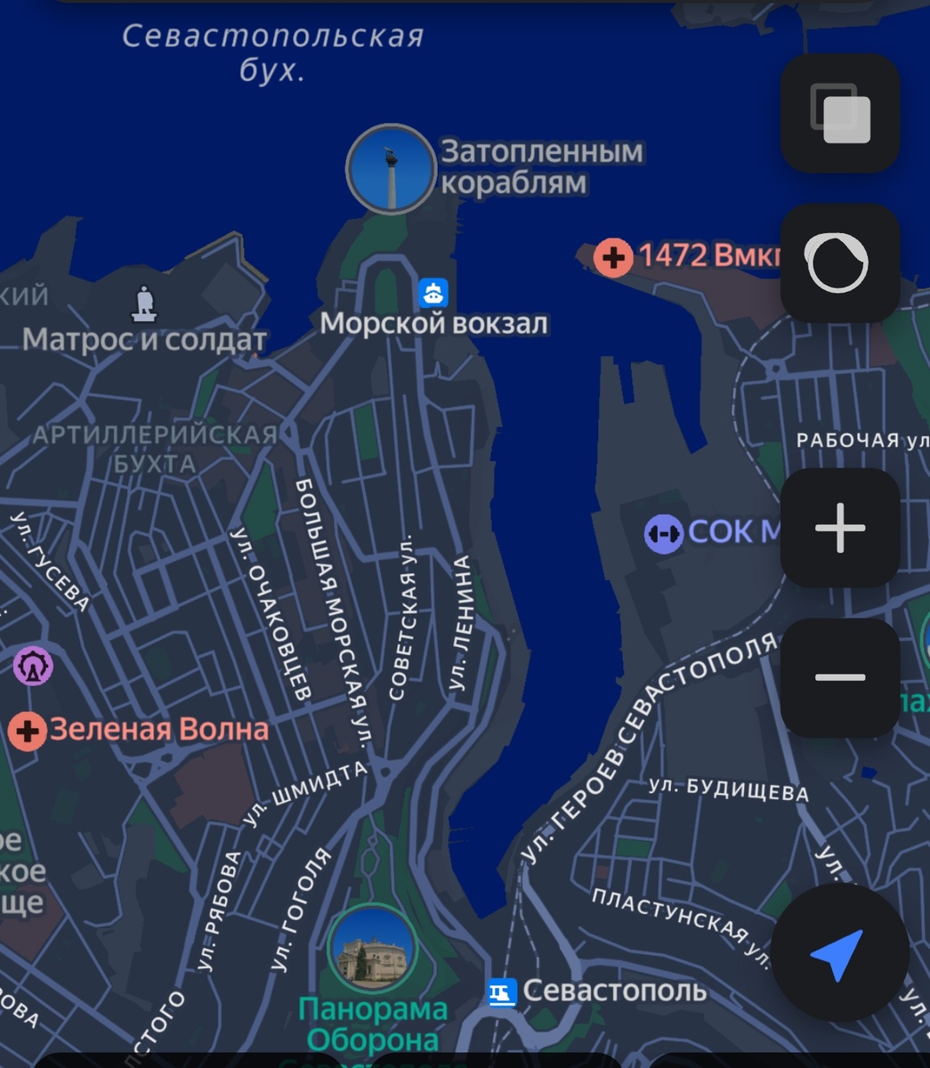 А Царская пристань находилась с этой же стороны, но в другой части бухты. О ней напоминает сейчас только название бизнес-центра. Вот его отметка на карте:
