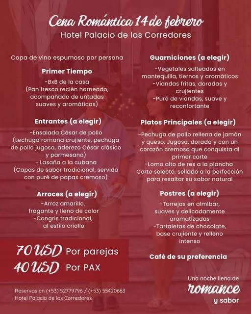 Если вы планируете провести День всех влюбленных на Острове Свободы, у меня есть отличная наводка. Palacio de los Corredores — это стильный отель в историческом центре (Habana Vieja), гарантирующий высокий стандарт обслуживания и соответствующую атмосферу. Их праздничное меню выглядит очень заманчиво. Предложение сформировано как полноценный сет из пяти подач, включающий как международную классику, так и национальные специалитеты: • Аперитив: Приветственный бокал игристого вина и фирменный бутерброд с паштетами. • Закуски: На выбор предлагается салат «Цезарь» или сытная лазанья "a la cubana". • Углеводная база и гарниры: Включены традиционный Congrís tradicional (рис с черной фасолью в креольском стиле) или так называемый "желтый рис" • Viandas: обязательно попробуйте жареные «виандас» (корнеплоды или платано) — это база кубинской кухни, без которой ужин не будет аутентичным. • Основные блюда: Выбор между фаршированной куриной грудкой и говяжьим стейком (Lomo Alto) на грил