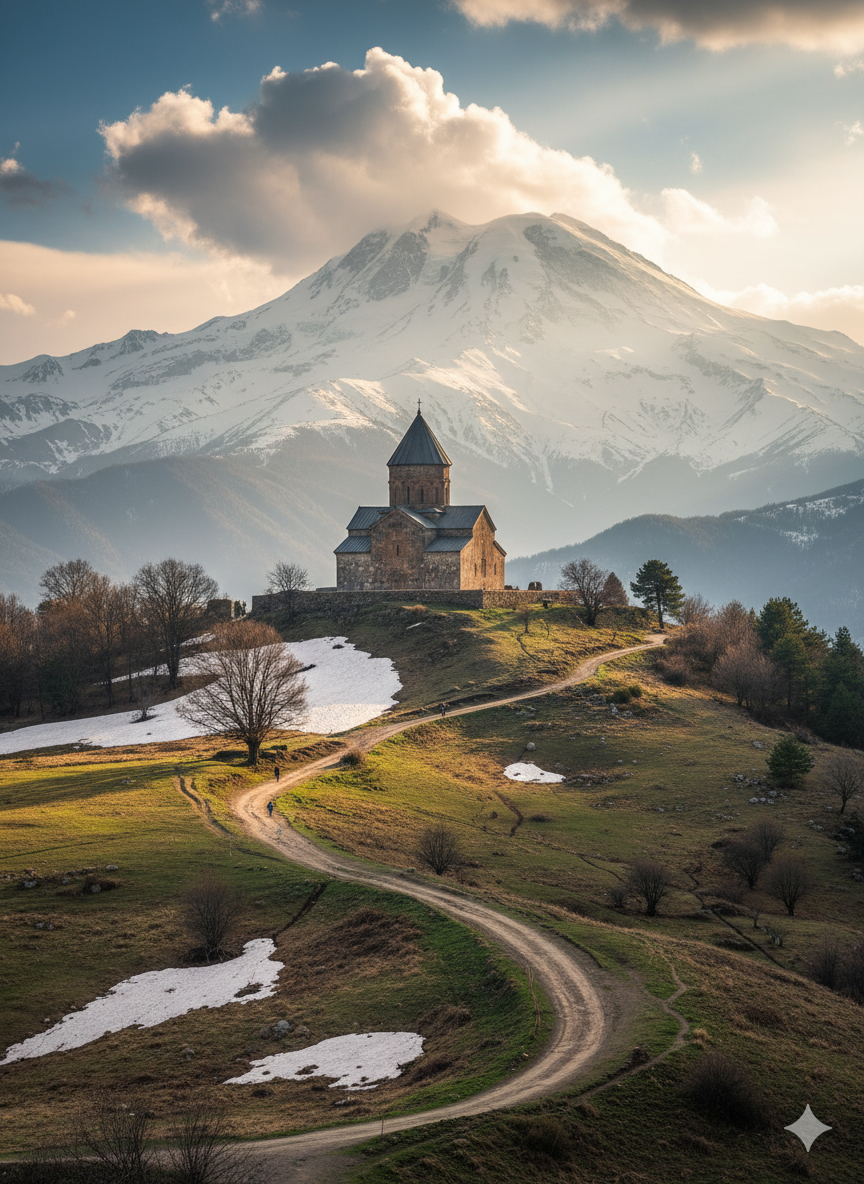 - Как добраться: маршрутка от метро «Дидубе» до Степанцминды (15 лари, 3 часа), далее подъём на джипе (50–80 лари) или пешком (1,5–2 часа).