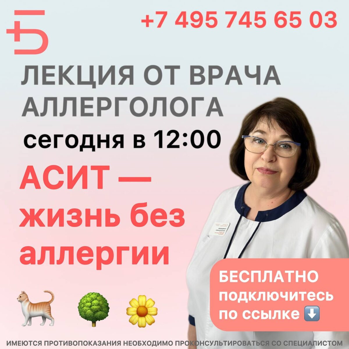 11 февраля в 12:00 приглашаем вас на бесплатную лекцию от медицинского центра "Доктор Боголюбов"! 🔥 Тема: "АСИТ — жизнь без аллергии" 👩🏻⚕️Лекцию проведет врач-терапевт, аллерголог-пульмонолог Померанцева Алла Евгеньевна. 🌼 Узнайте больше о причинах аллергии, методах диагностики и современных подходах к лечению. ✅ Ссылка на участие