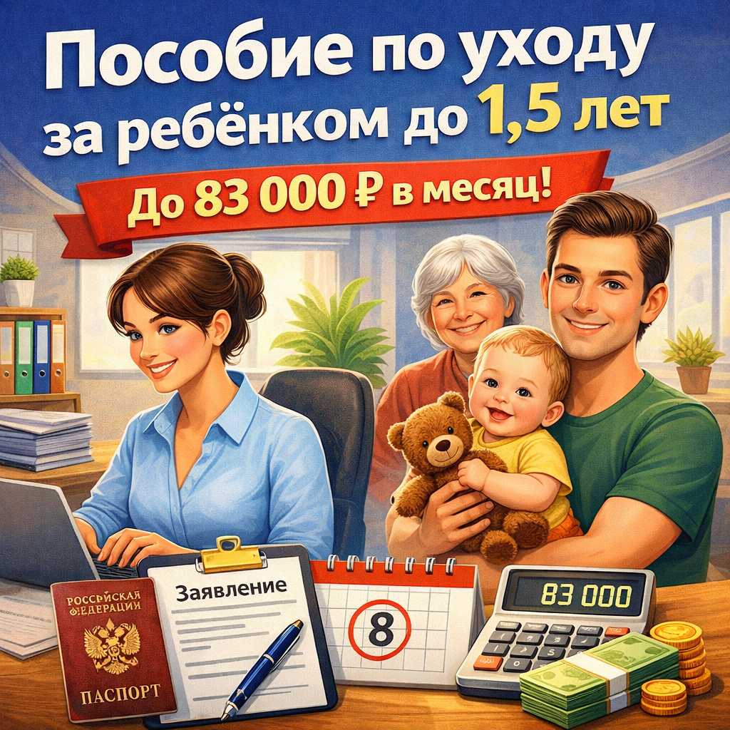 Короткий ответ: в 2026 году работающий родитель может оформить пособие по уходу за ребёнком до 1,5 лет и получать до 83 021 ₽ ежемесячно. Выплата сохраняется даже при выходе на работу на полный день.