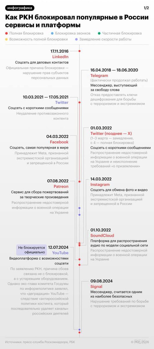 Всего с 2016 года заблокировано 16 крупных платформ. Основные причины блокировок в России остаются прежними: сервисы отказывались выполнять требования законодательства, не переносили персональные данные россиян на территорию страны, игнорировали предписания по удалению запрещённого контента, не открывали официальные представительства в РФ, нарушали правила распространения информации и систематически не исполняли решения судов и штрафы, сообщает РБК. ПОДПИШИСЬ 🔴 ПРЕДЛОЖИ Ⓜ МАХ НАШ