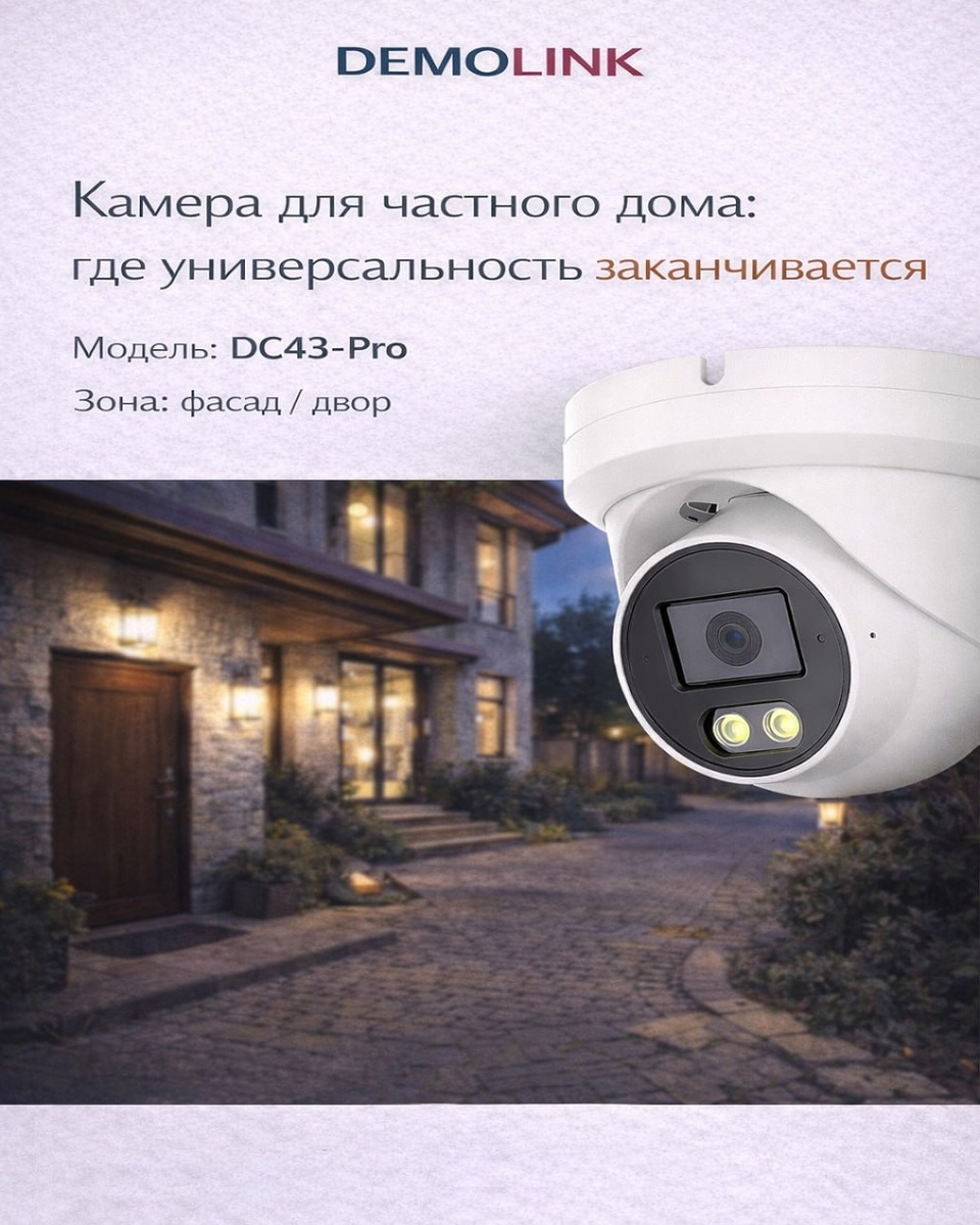 Модель: DC43·Pro Зона: фасад / двор После разговора о том, почему частный дом нельзя воспринимать как одну точку наблюдения, логично посмотреть на самый распространённый выбор — камеру на фасад, чтобы «держать под контролем двор» 👀 DC43·Pro — как раз из таких решений. Эта камера уверенно чувствует себя там, где важна общая картина происходящего. Фиксированный объектив 3.6 мм (около 82° по горизонтали) даёт спокойный, понятный охват территории: движение людей, перемещения во дворе, общую активность вокруг дома. Разрешение 4 Мп (2560×1440) здесь работает именно как обзорное — достаточно деталей, чтобы понимать, что происходит, без попытки «дотянуться» до мелочей на расстоянии. Это делает DC43·Pro стабильным выбором для фасада и двора — без необходимости постоянной подстройки. Но как только от камеры начинают ждать большего, проявляются её естественные границы. У входа важны лица и работа на близкой дистанции 🚪 В дальних зонах — расстояние и точность Ночью — предсказуемое поведе