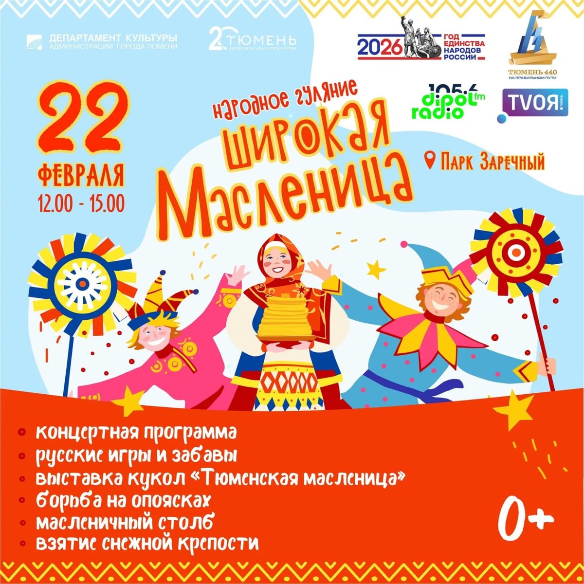 🥞 Приглашаем всех желающих вместе отметить Масленицу! 22 февраля ровно в полдень на территории парка Заречный начнется веселое народное гулянье с песнями, плясками и вкуснейшими блинами! На празднике гостей ждут традиционные забавы: катание на санях, соревнования по перетягиванию каната, народные игры и хороводы, масленичный столб, взятие снежной крепости. Для детей будет организована развлекательная программа с конкурсами и призами. А еще каждый сможет отведать ароматные блины с разными начинками прямо с пылу-жару от мастеров кулинарии. Приходите всей семьей насладиться теплом русской зимы, зарядитесь хорошим настроением и весельем! По информации департамента культуры администрации города Тюмени